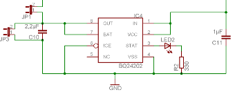 Als Spannungsquelle steht immer ein Lithium Ionen Akku zur Verfügung aus dessen Spannung (ca. 3,6 V bis 4,2 V) alle anderen Spannungen erzeugt werden müssen. Wenn das Gerät an einen USB Port angeschlossen ist, wird der Akku geladen. Als Lithium Akkulader wird ein BQ24202 von TI eingesetzt. Das IC benötigt nur wenig Außenbeschaltung und ist klein. Der Maximale Ladestrom beträgt 500 mA.