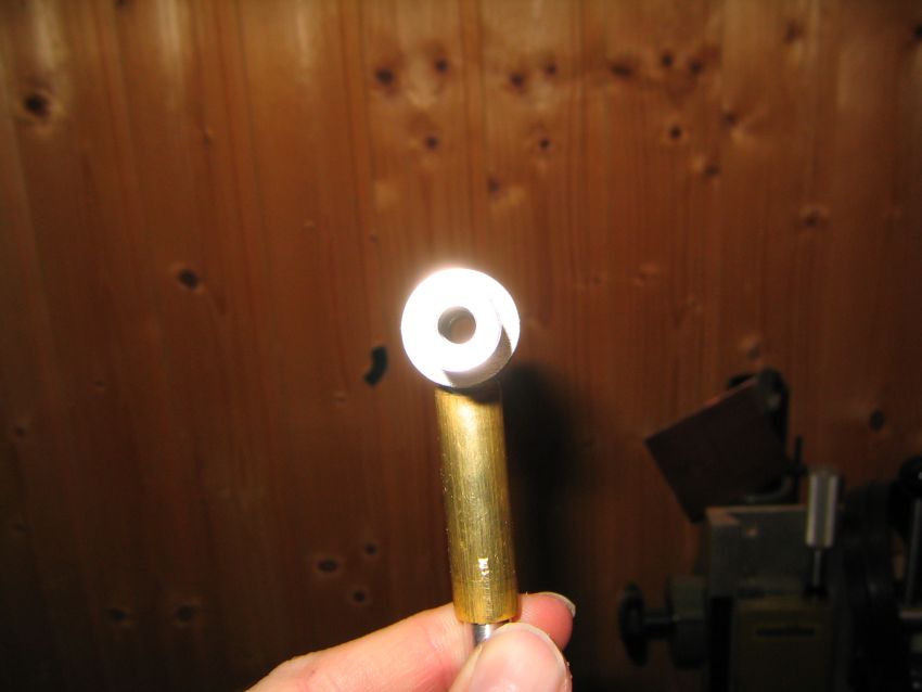Als erstes dreht man aus einem dünnen Stück Vollmaterial (in unserem Fall Alu) eine Röhre, die in die Ausblaspistole geschraubt werden kann. Hierzu versieht man das fertige Werkstück mit einem geeigneten Außengewinde, welches man beidseitig aufschneidet.