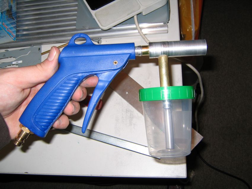 Man schraubt alles zusammen und befestigt den Sandstrahl-Aufsatz auf der Ausblaspistole. Nund muss man mit der Einschraubtiefe beider Zuleitungen solange experimentieren, bis an der Strahlgutaufnahme ein möglichst hoher Sog entsteht.